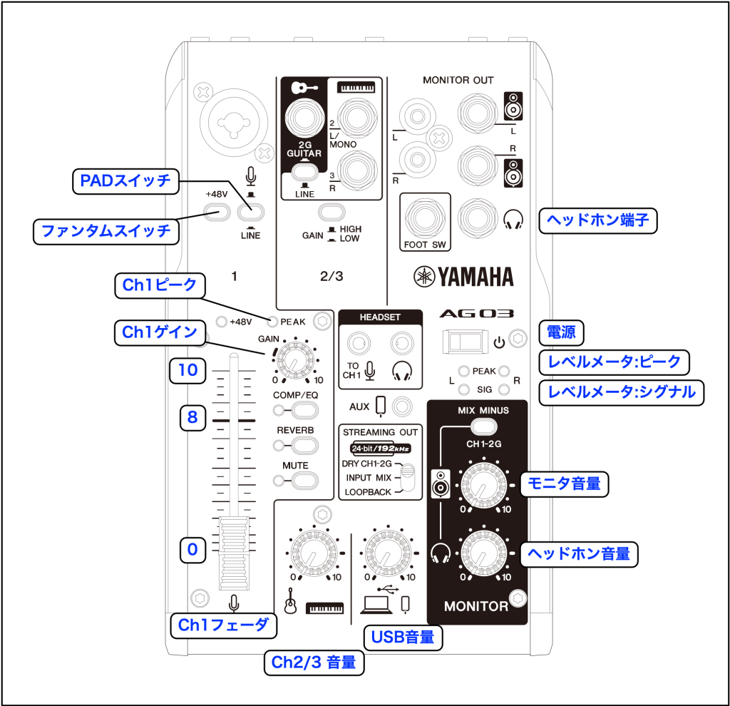 ヘッドホン音量を4くらいの位置にし、声を出しながらCh1ゲインをあげていってください。レベルメータ:シグナルが点灯し、自分の声が聞こえてくるはずです。マイクにもよりますが、7~9くらいまでの位置まであげる感じになるとおもいます。