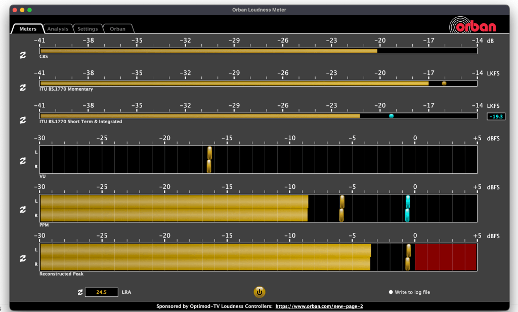USB出力のレベルを正確に知るには、Orban Loudness Meterが便利です。これはFMラジオ局などで使われているシグナルプロセッサを作っているOrbanというメーカが無料で提供しているレベルメータソフトです。プロ向けのメータなのできちんとみるのは難しいですが、要点さえ押さえればOKです。