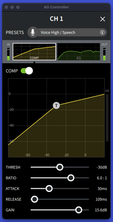 普通にしゃべっているときにGR(ゲインリダクション)のバーがほんのちょっとだけ動くくらいまでTHRESH(スレッショルド)を下げていきます。次にレベルメータをみながらちょうどいいくらいまでGAIN(メイクアップゲイン)をあげます。Ch1ゲインのつまみが10になっていたら、9くらいまで下げてGAINを上げましょう。