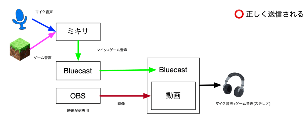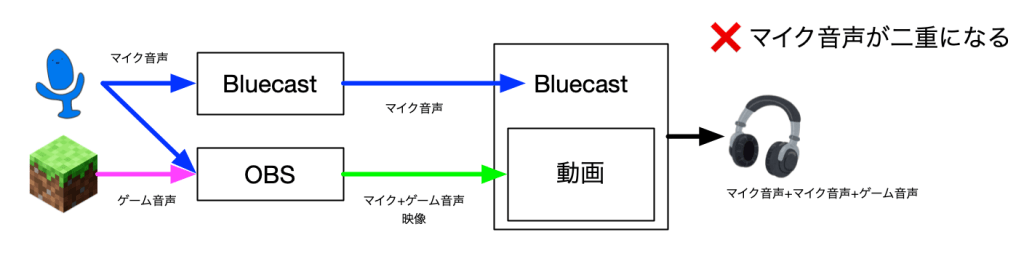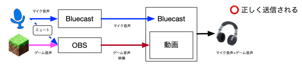 Bluecastは音声配信の仕組みに、動画配信の機能を重ねあわせるような仕組みになっています。この動画配信自体に音声を配信する機能があるので、OBS側のマイクをミュートにしないと、少しずれた声が届いて、音声が二重になってしまうためです。