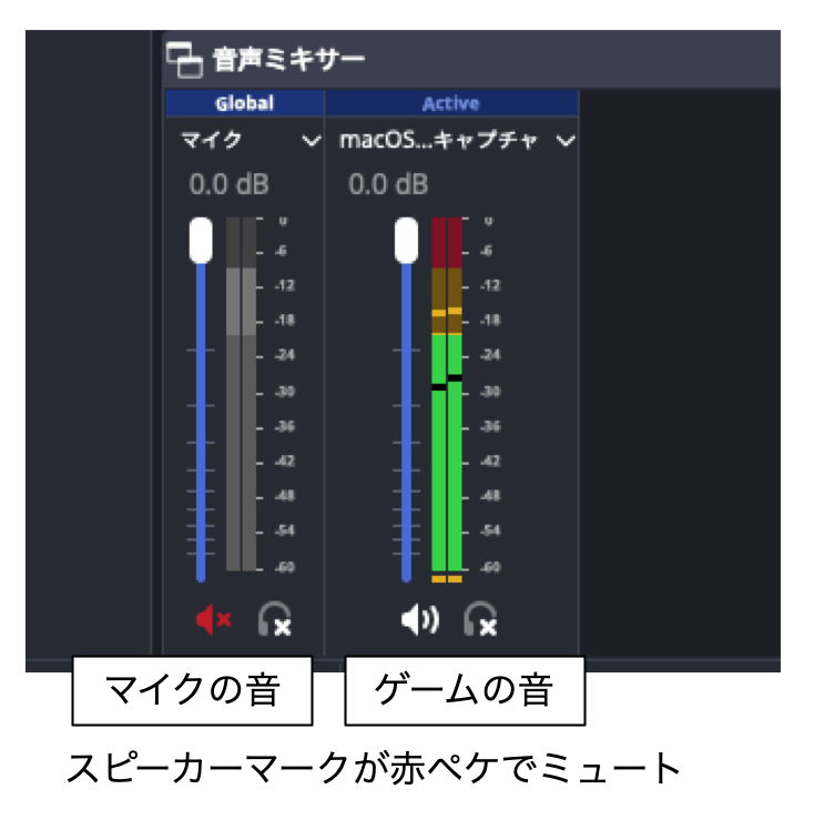OBSの音声ミキサーのマイクのスピーカーマークをクリックし、赤にペケがついた状態にすることで、ミュートにすることができます。